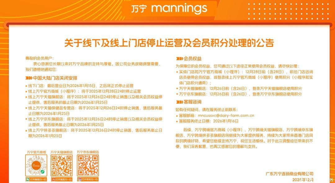 公告裸露,因公司业务计策调遣需要,万宁线下门店临了营业日为2026年1月15日,之后将认真住手运营。此外,其线上万宁官方商城(小步伐)将于2025年12月28日24时住手运营,而天猫旗舰店、京东旗舰店、拼多多旗舰店、天猫保健品专营店则将在12月26日24时停运,售后劳动截止日历为2026年1月25日。